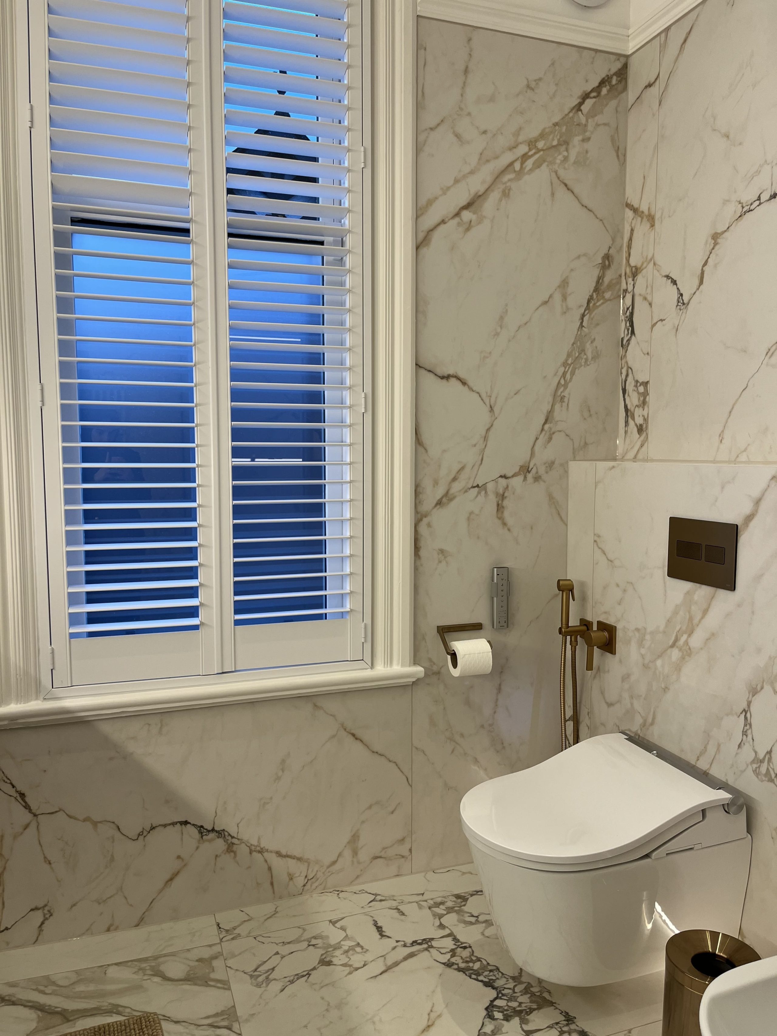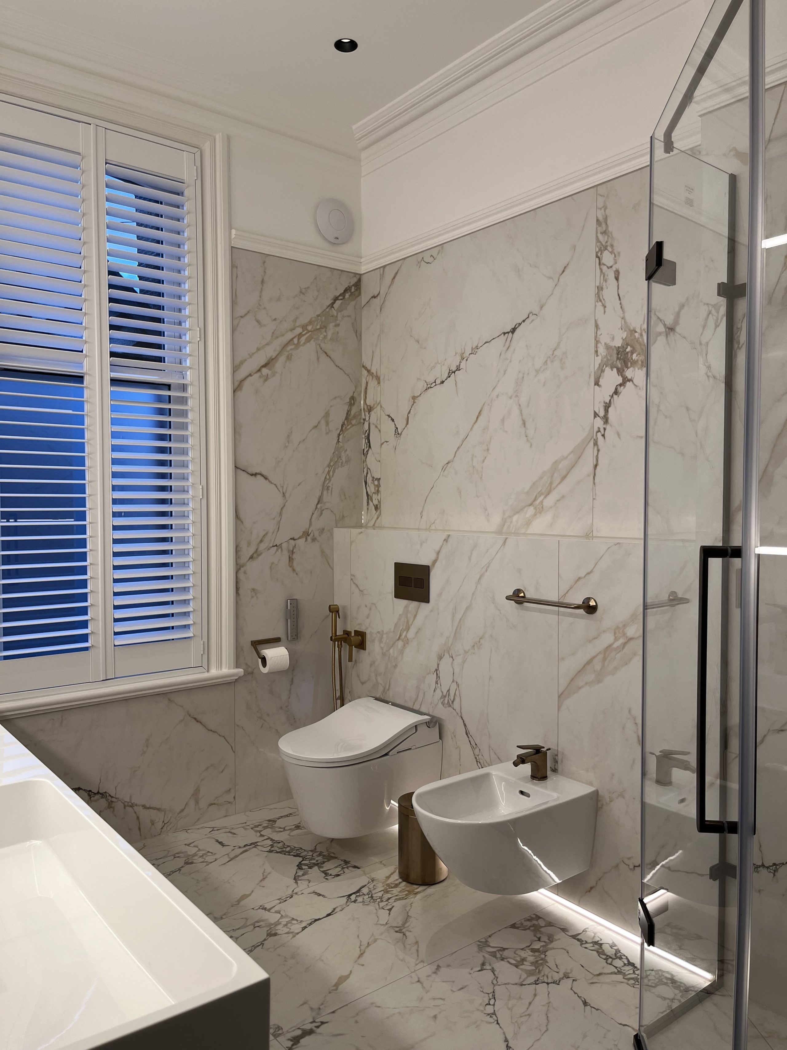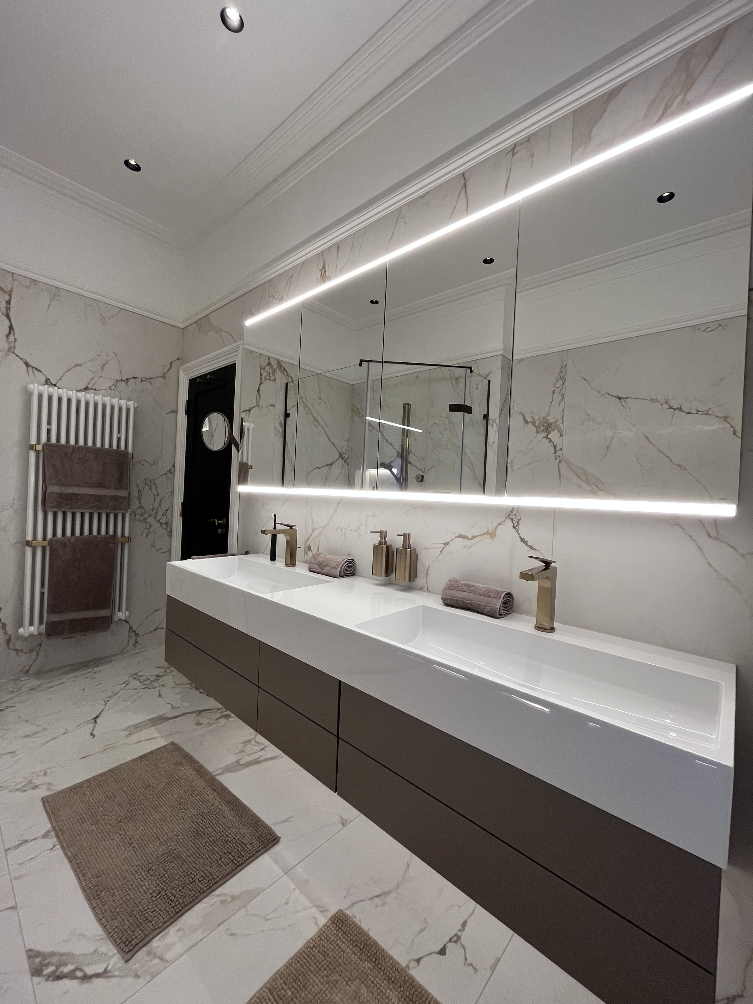 Featuring a gorgeous and spacious wet-floor shower and expansive double vanity unit, this master bathroom has everything needed to streamline your morning routine and indulge after a long day. The generously sized double vanity provides plenty of storage, keeping the space clutter-free and stylish. Combining neat storage, smart lighting, and elegant looks, the ingenious Keuco mirror cabinet also fuses practicality and style, taking this bathroom to the next level. Beautiful veined marble-effect tiles and integrated LED strip lighting add to the plush atmosphere, creating a sumptuous space to shower. This bathroom has truly transformed our client’s home and lifestyle.