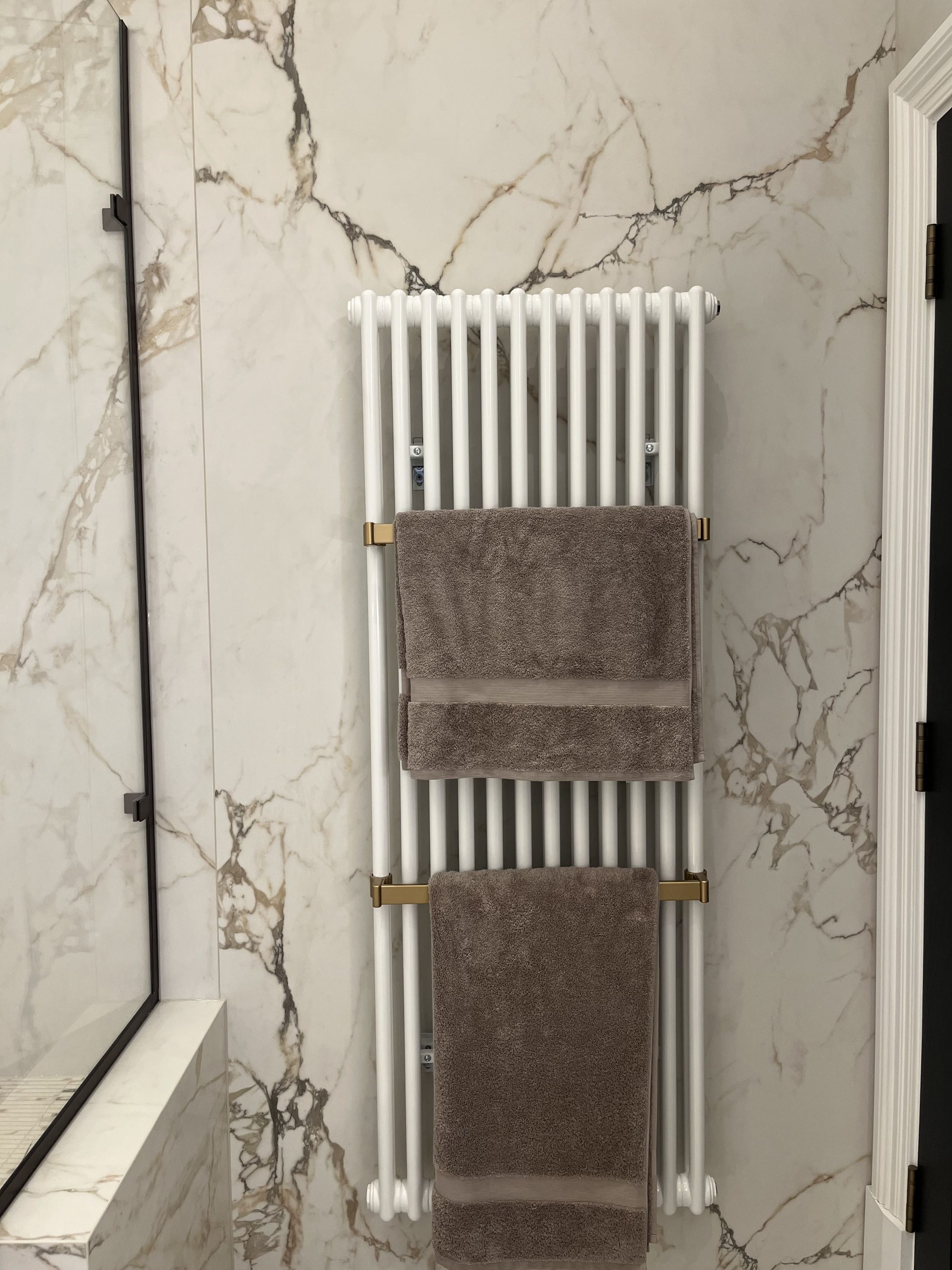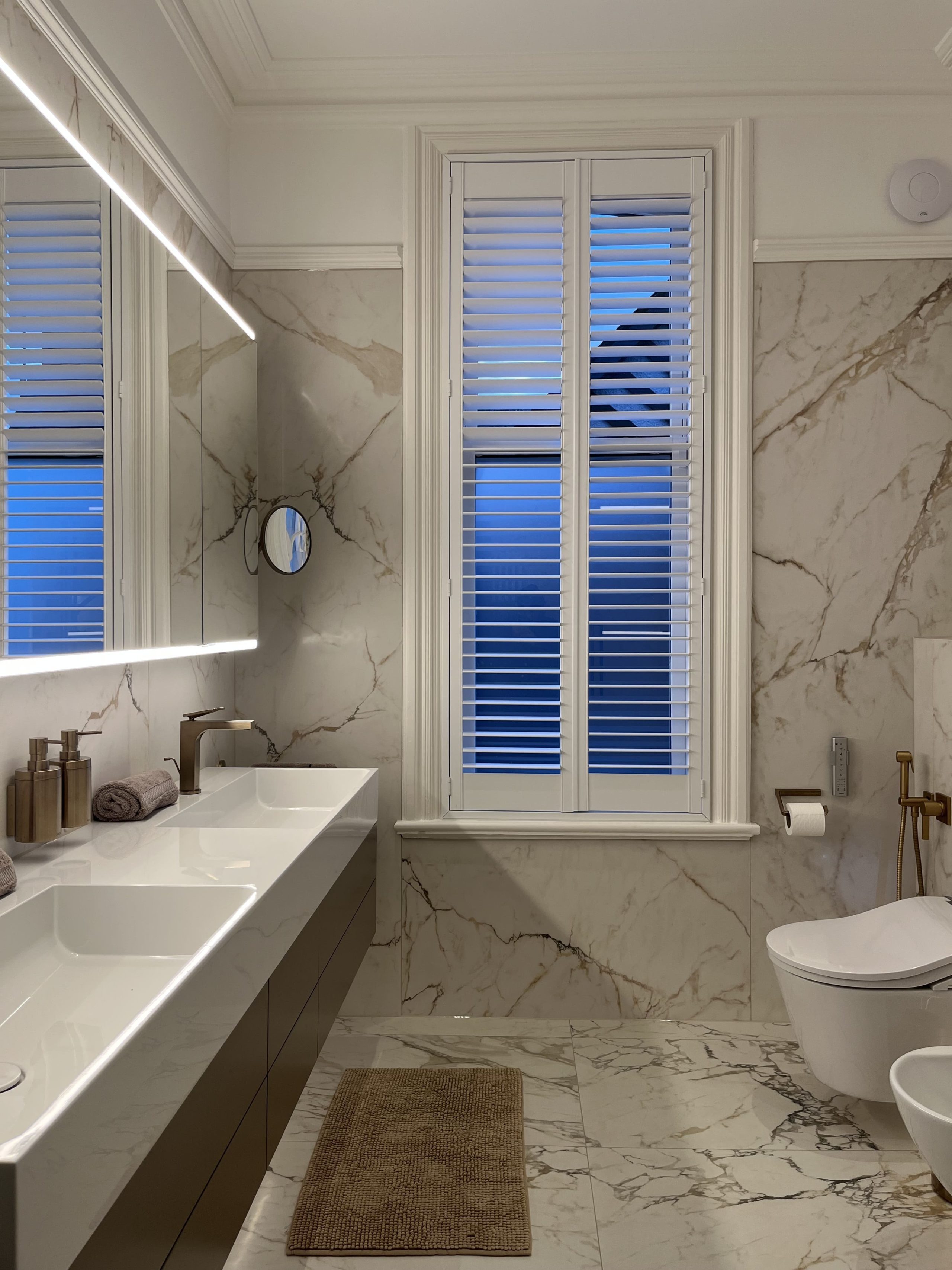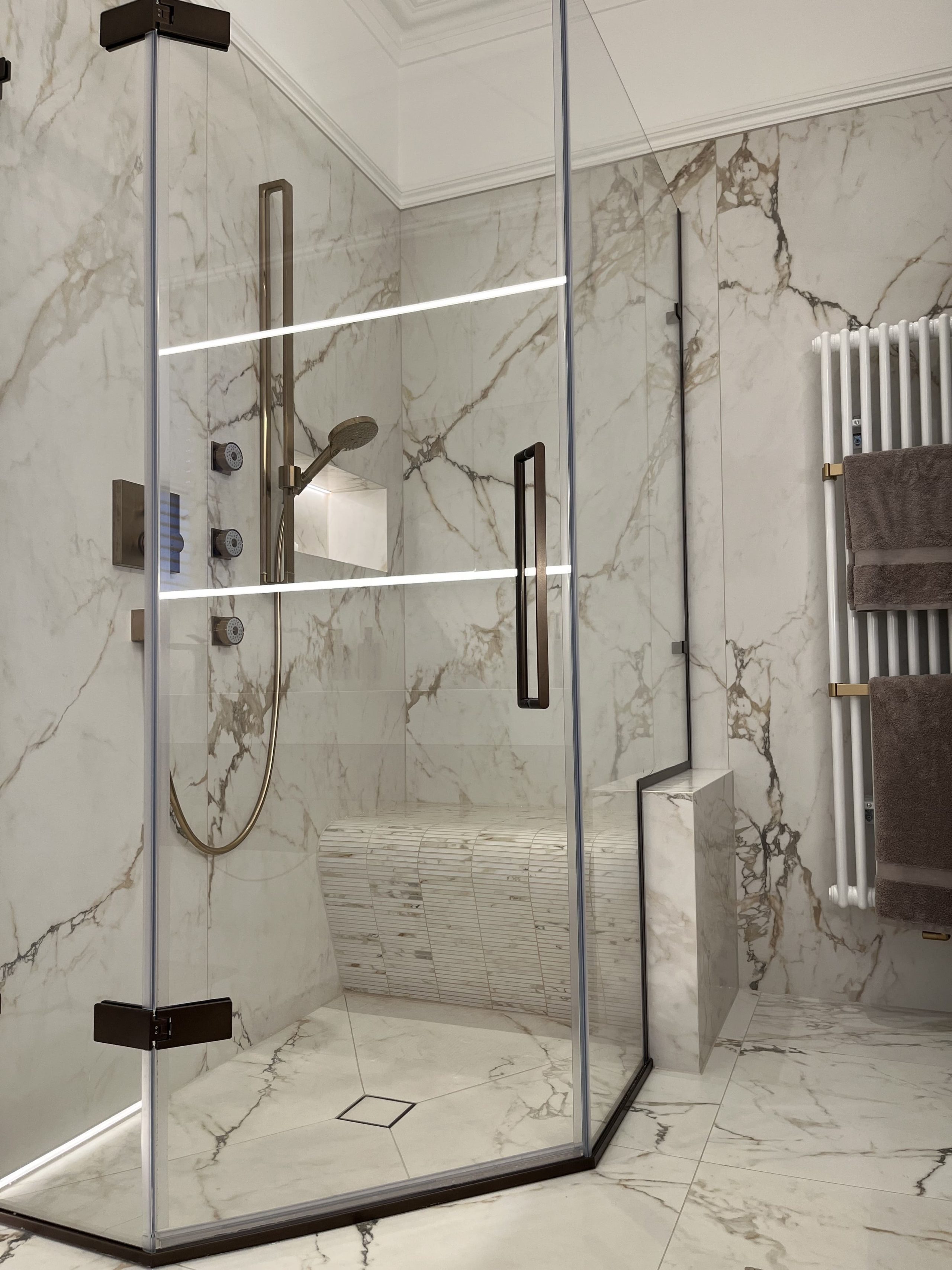 Featuring a gorgeous and spacious wet-floor shower and expansive double vanity unit, this master bathroom has everything needed to streamline your morning routine and indulge after a long day. The generously sized double vanity provides plenty of storage, keeping the space clutter-free and stylish. Combining neat storage, smart lighting, and elegant looks, the ingenious Keuco mirror cabinet also fuses practicality and style, taking this bathroom to the next level. Beautiful veined marble-effect tiles and integrated LED strip lighting add to the plush atmosphere, creating a sumptuous space to shower. This bathroom has truly transformed our client’s home and lifestyle.