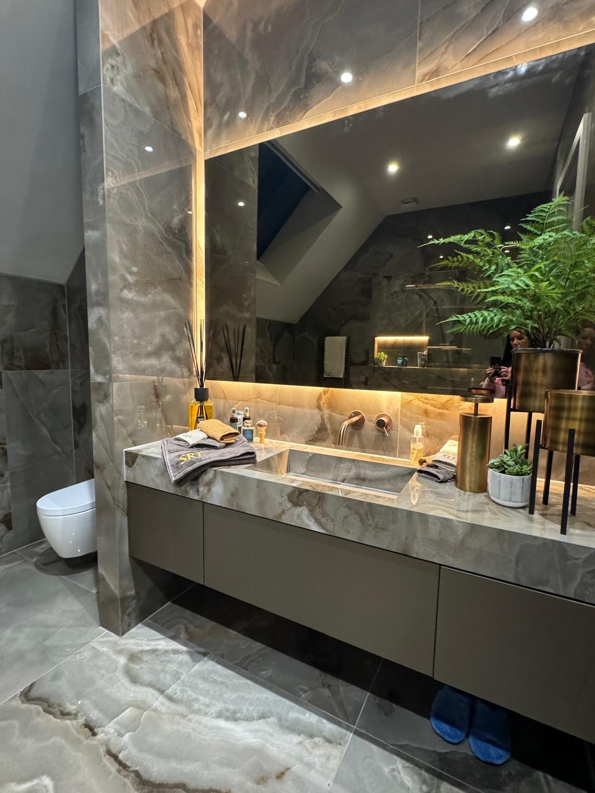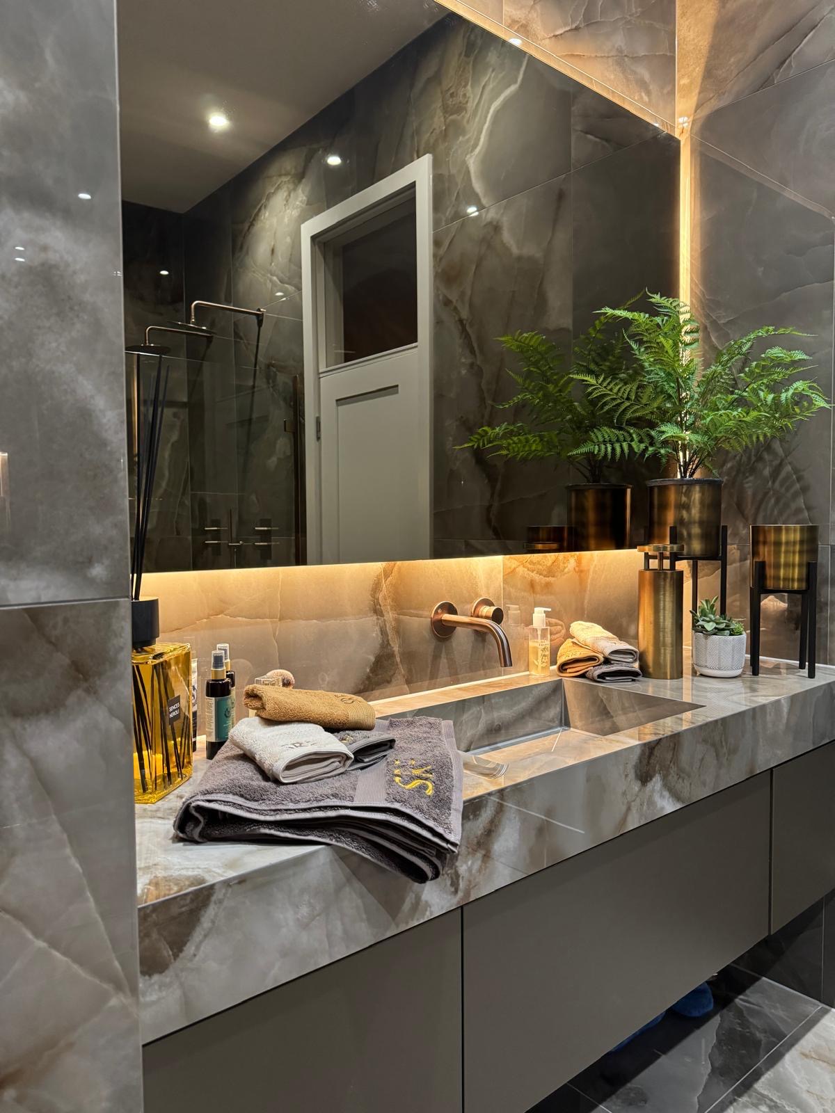 This breathtaking master bathroom makes a luxurious design statement. Beautifully veined Rêve Choco tiles seamlessly cover the walls and floor, creating a sense of drama whilst opening up the space. The real centrepiece is the custom-fabricated double washbasin, which, framed by an impressive backlit mirror, offers both practicality and creates a high-end, sculptural aesthetic. Its clean lines and minimalistic elegance effortlessly complement the sleek and sophisticated space.