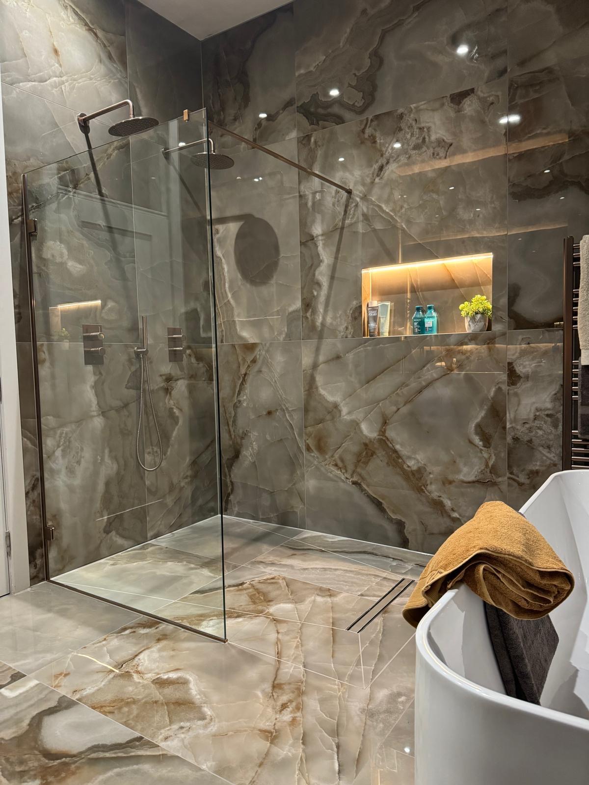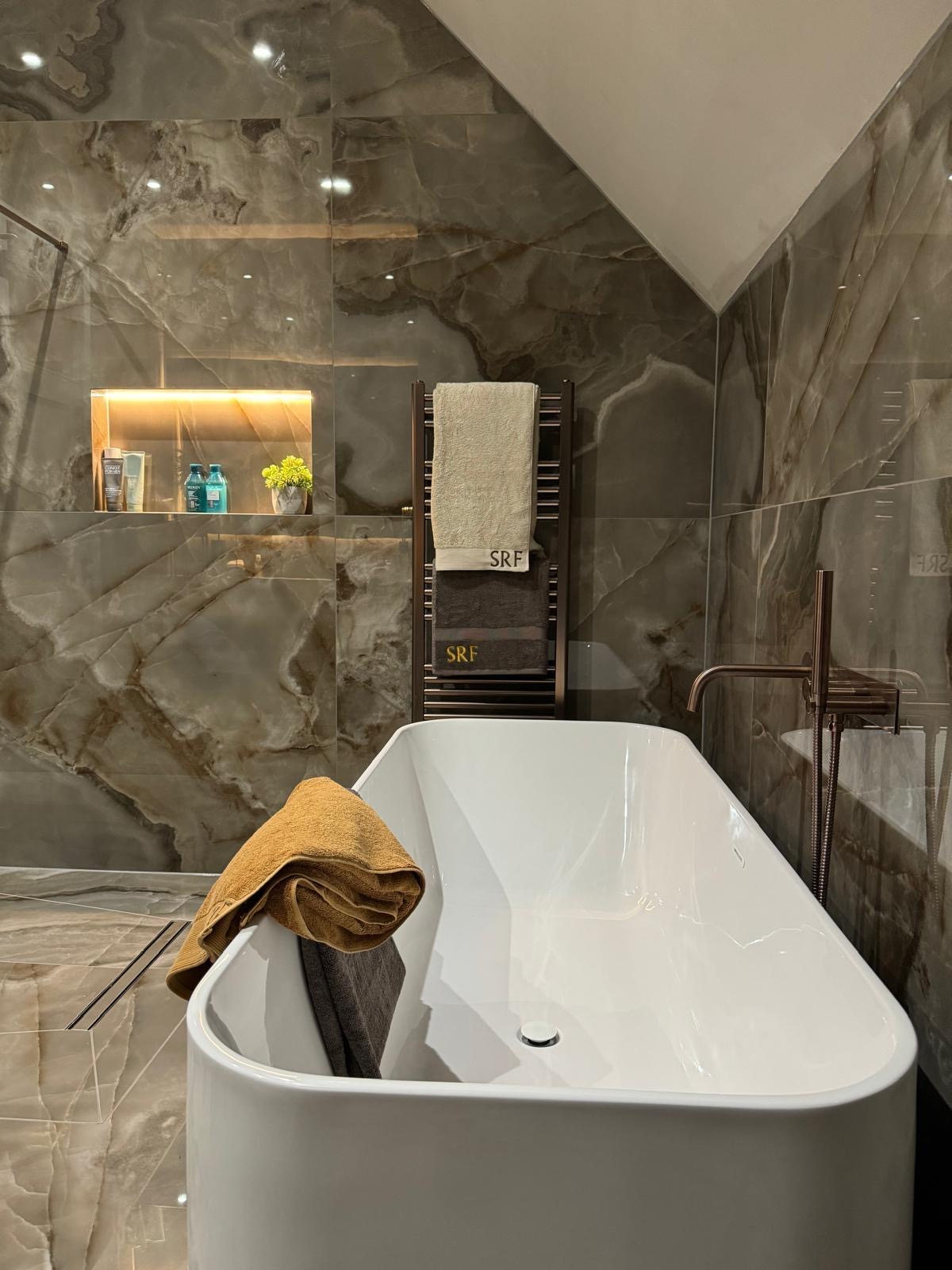 A statement Villeroy & Boch bathtub elevates the interior, adding an opulent touch while offering a sumptuous place to soak. Soft LED lighting completes the design, highlighting the stunning tilework and creating a warm, inviting ambience. This space undeniably demonstrates our design expertise, creative flair, and commitment to quality.