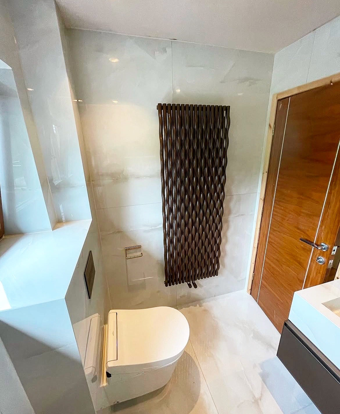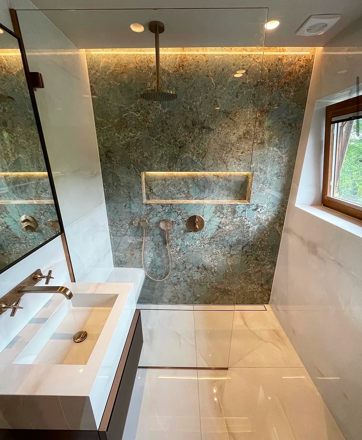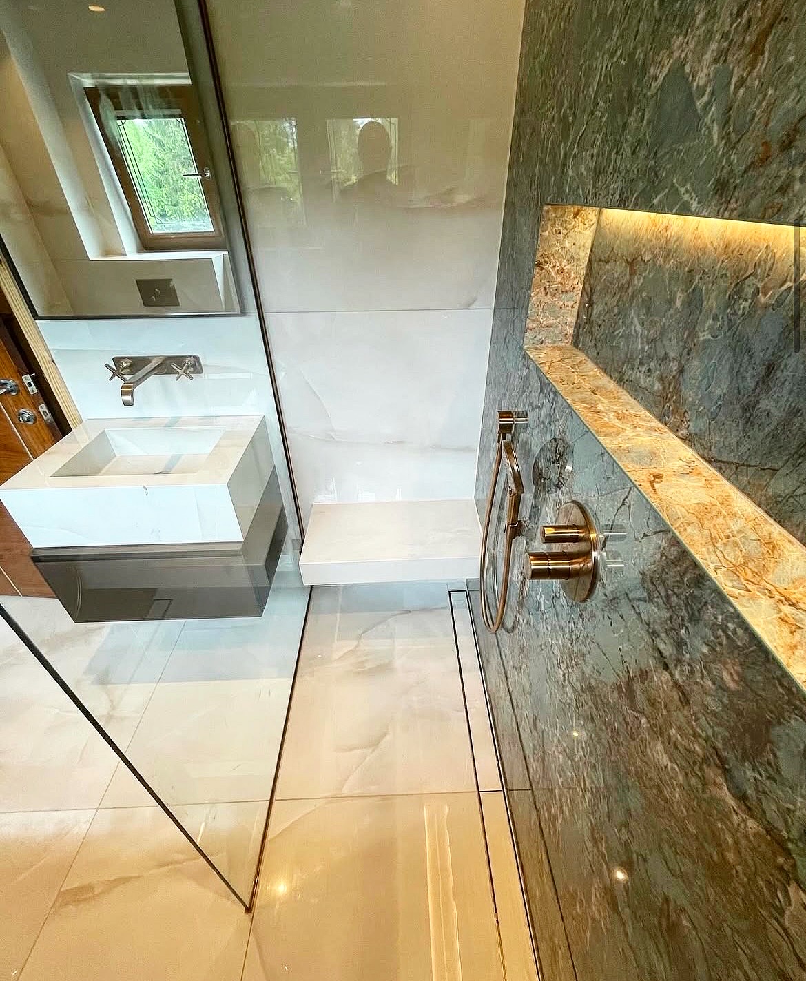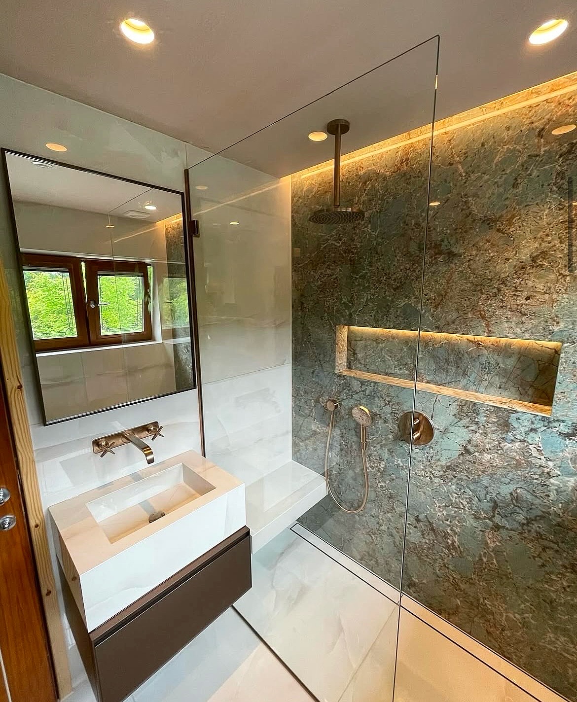 The standout detail at the heart of this design is the striking feature wall clad in a richly veined tile, chosen for its stunning natural beauty. A recessed niche, enhanced by soft LED lighting, adds both elegance and function, creating a calming, ambient glow. Needless to say, our clients were delighted with the end result.