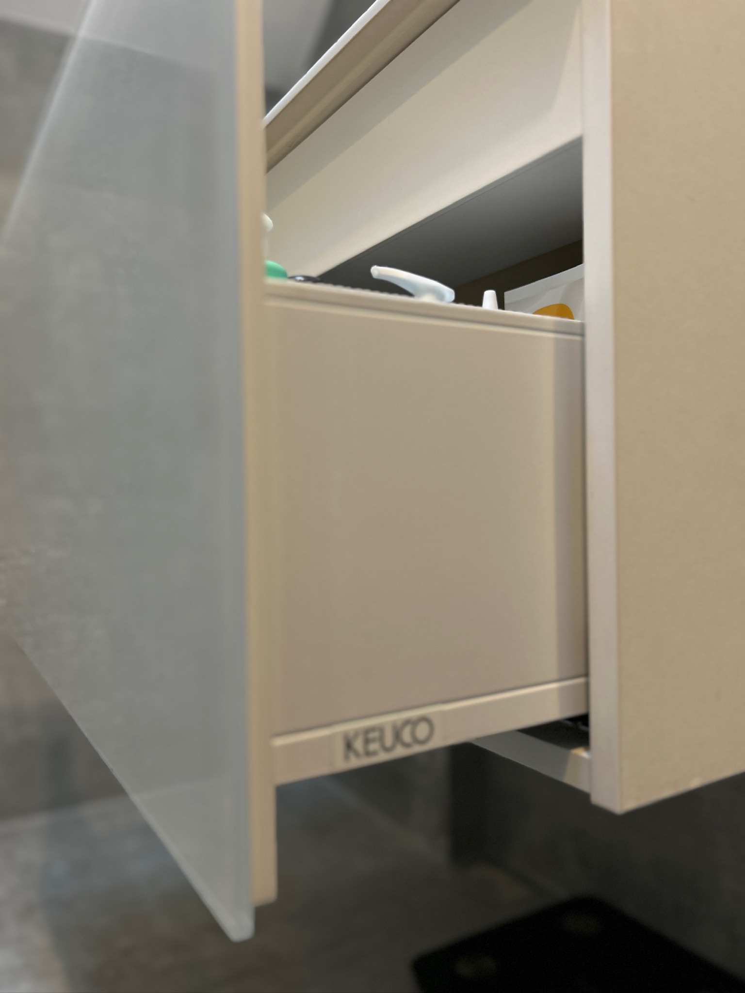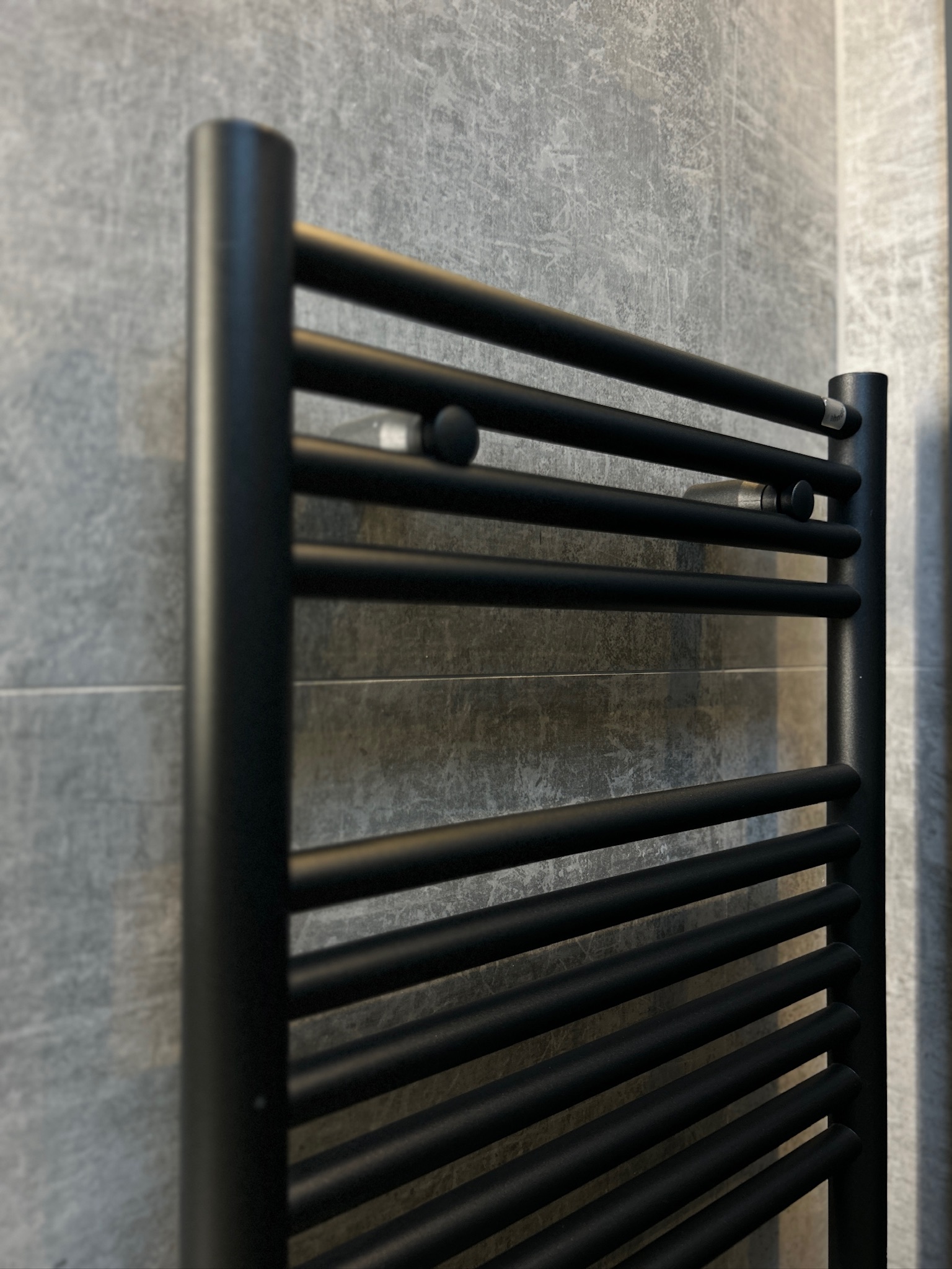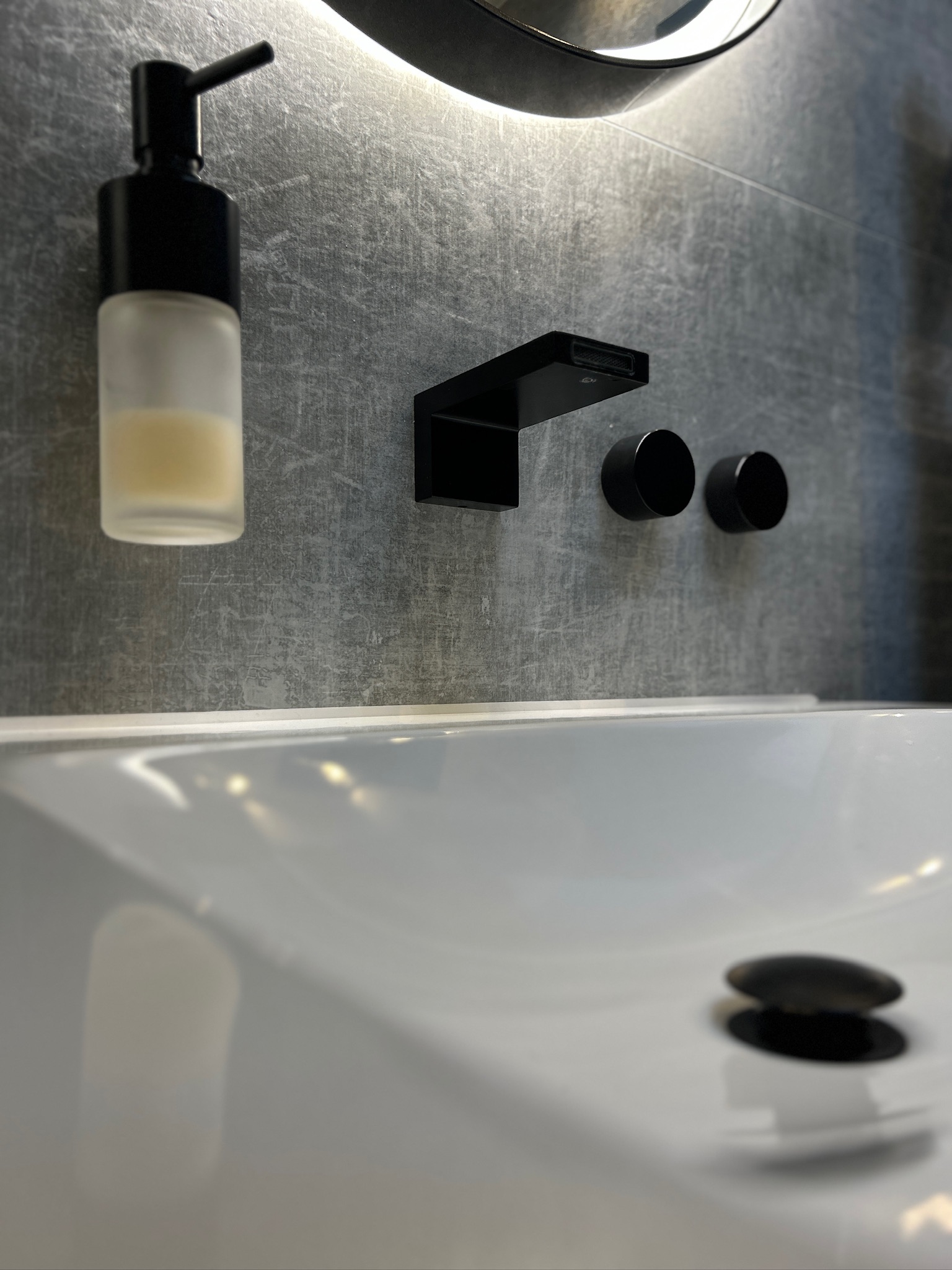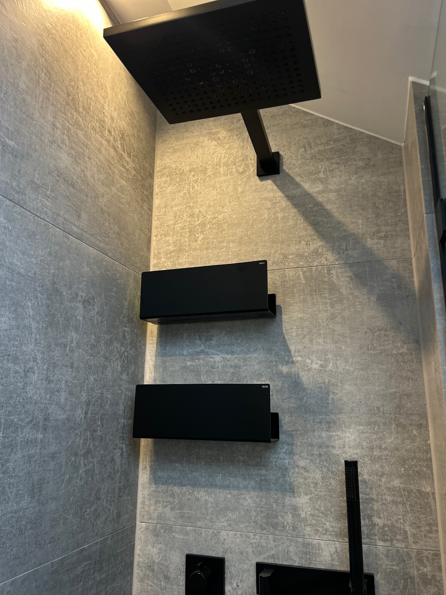 This compact en-suite has been thoughtfully designed to maximise every inch. The concrete grey floor-to-ceiling tiles create the illusion of space whilst establishing a minimalist modern feel. Sleek Keuco matt black fittings and furniture create a striking contrast for a stylish and sophisticated finish.