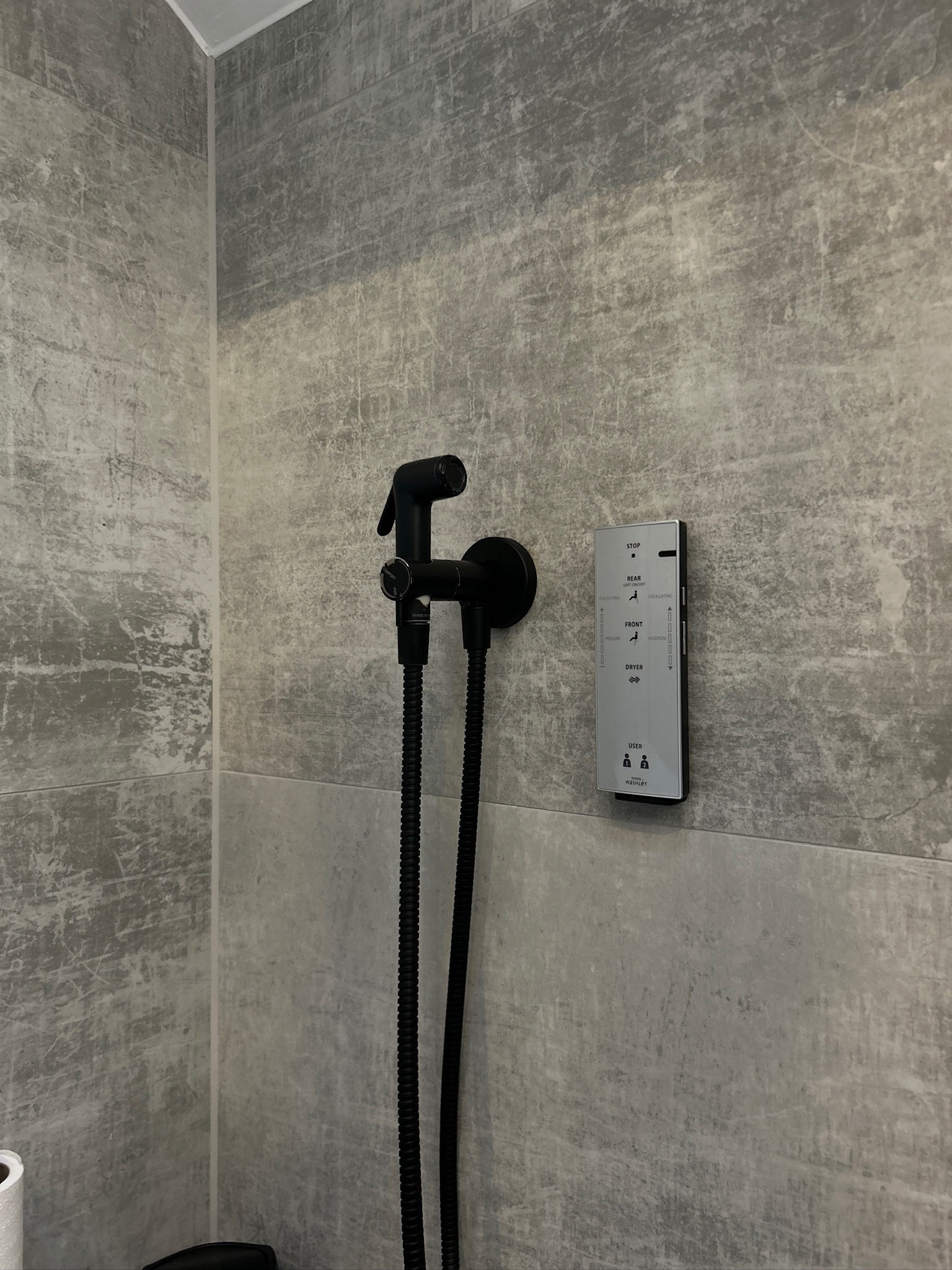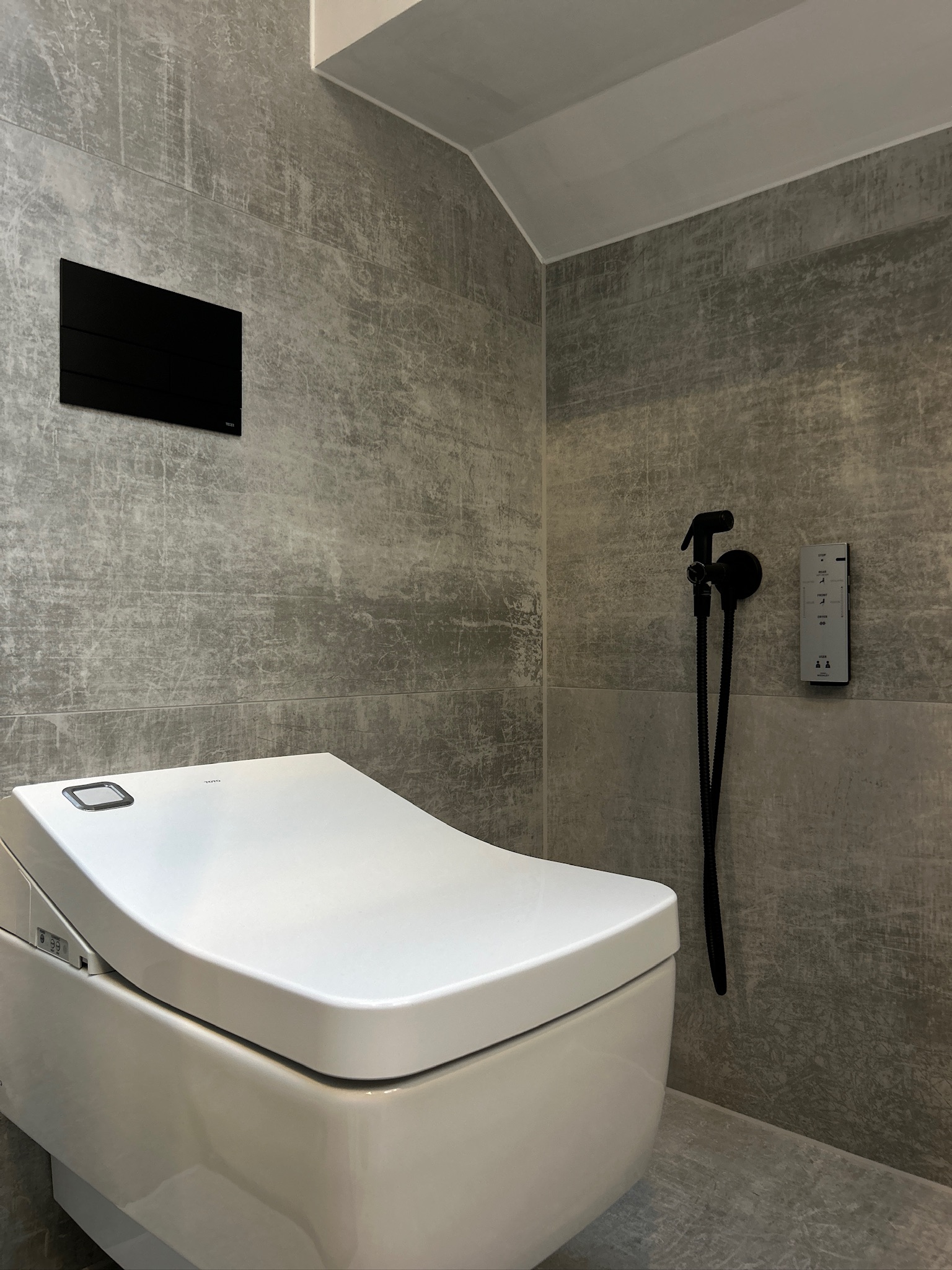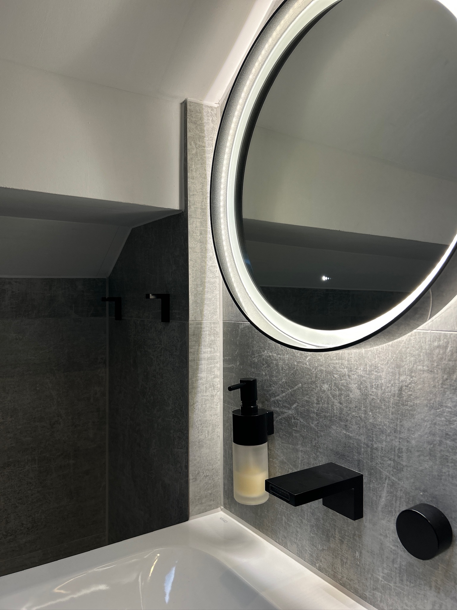 The standout feature is the LED-lit round mirror, which not only adds to the ambience and improves visibility but also creates the illusion of a larger room. This bathroom is a perfect example of how intelligent design can enhance both style and functionality in even the smallest of spaces.